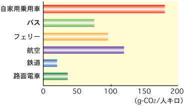 私たちのエネルギーの使い過ぎにより大量の二酸化炭素が排出され、急速に地球温暖化が進みつつあります。 バスを使うことは効果的な温暖化対策!輸送機関別 1人当たりの二酸化炭素排出量